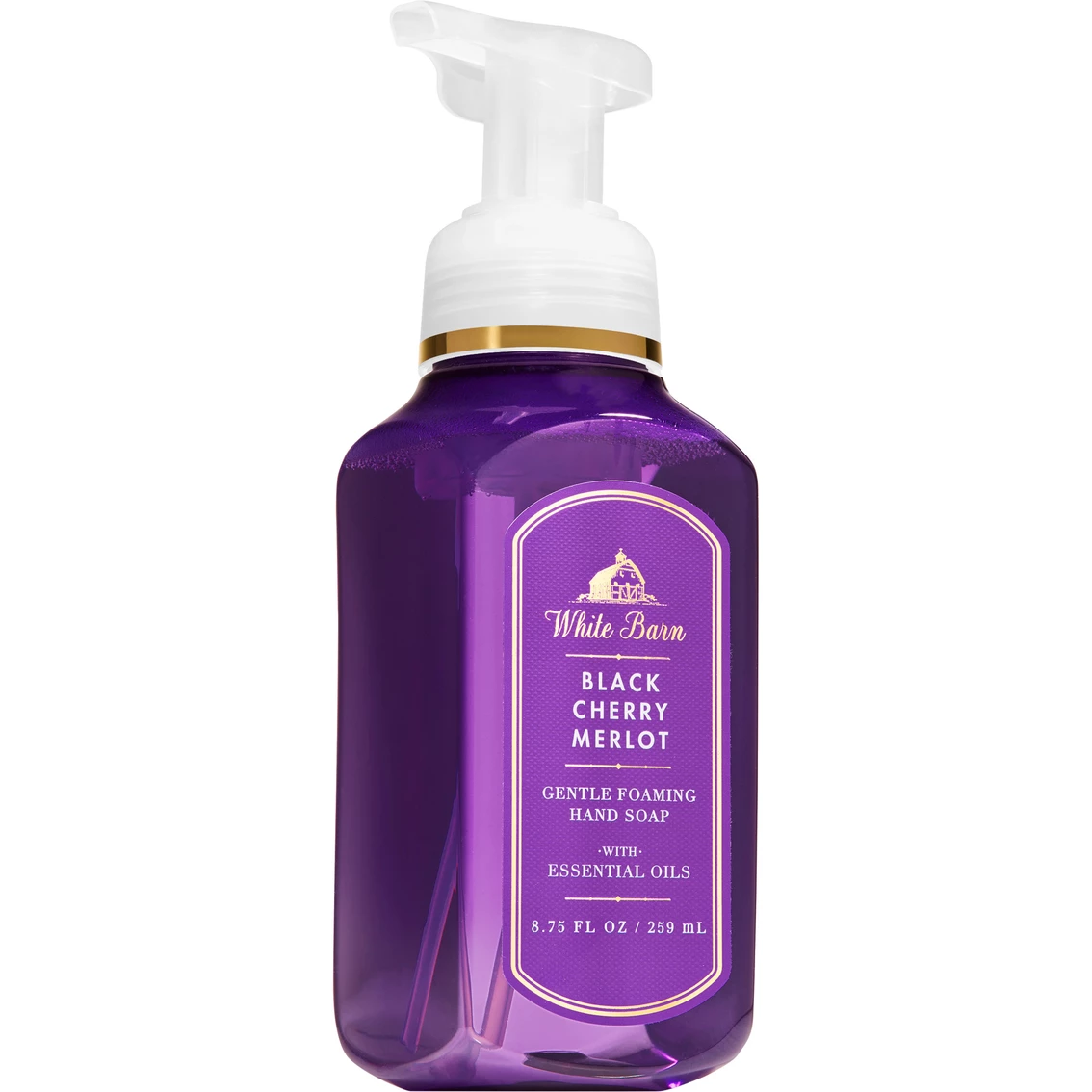 The gentle Bath & Body Works White Barn Color Black Cherry Merlot Foaming Soap with essential oils combines nourishing Vitamin E with softening Shea Extract and Aloe to deliver a rich lather, gently washing away dirt and germs. Get ready to fall in love with this scent. Model: 85186.