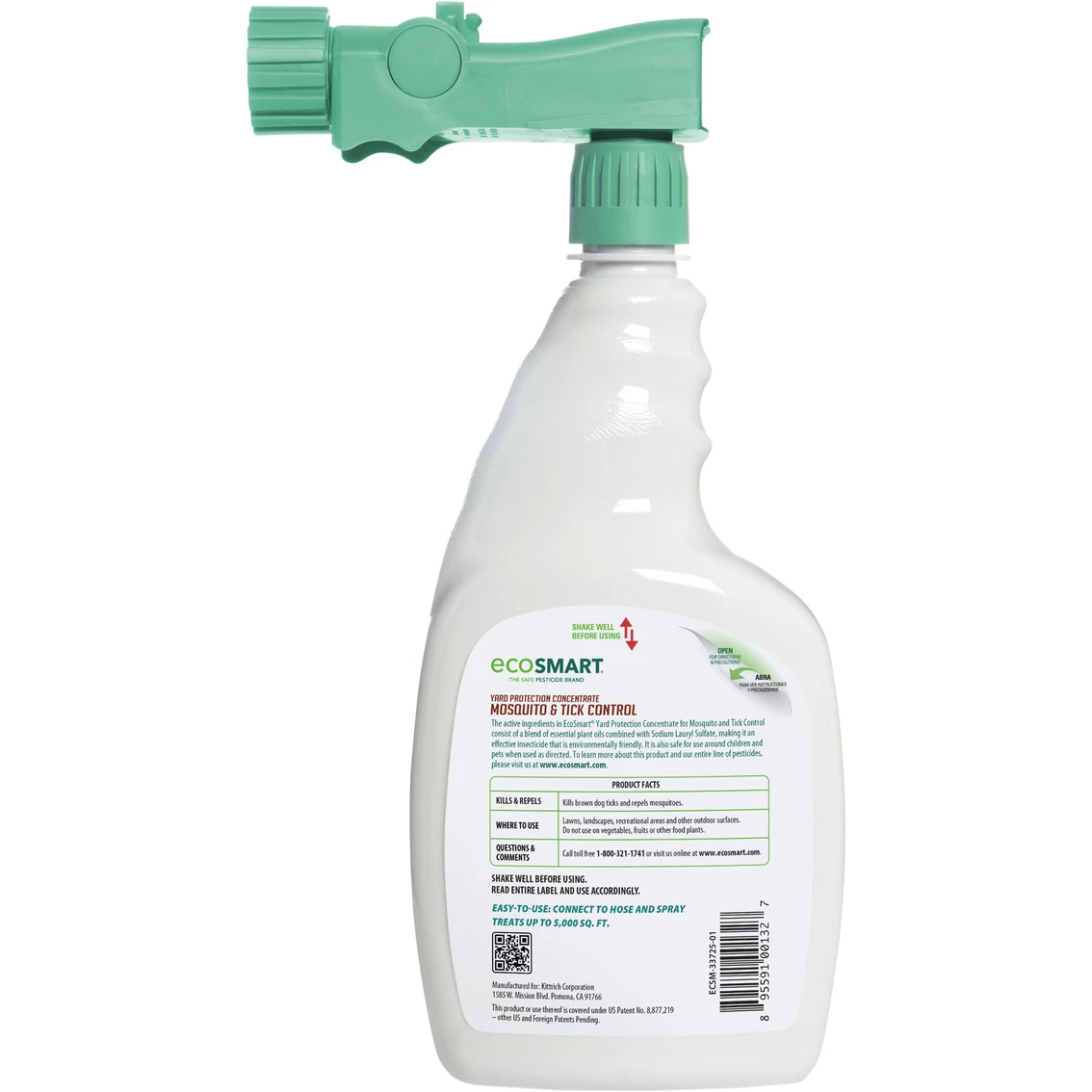 EcoSmart’s Natural, plant-based Yard Protection Concentrate Mosquito and Tick Control work on contact with the help of plant-based essential oils, like Rosemary Oil, Peppermint Oil, Clove Oil, Sesame Oil, Thyme Oil and other active ingredient. Just attach to your hose and spray on lawns, landscapes, recreational areas and other outdoor surfaces. Treats up to 5000 square feet. Not use for on vegetables, fruit or other food plants. Safe to use around children and pets (when used as directed). It won’t harm fish, wildlife or contaminate ground water supplies. You can feel good about using EcoSmart products in and around your home. EcoSmart has been creating safe, effective ways to eliminate pests and weeds for almost two decades. With their proprietary formulas of plant-based essential oils, EcoSmart is protecting you, your family, your pets and the ecosystem from harmful chemicals and disease spreading pests. Model: ECSM-33725-01EC.