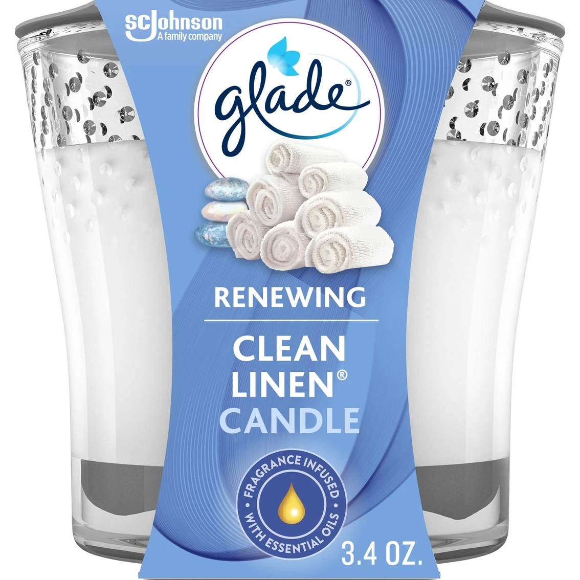 The Glade Clean Linen Candle, the classic scent of line-dried laundry, gets a modern twist of sunny citrus with a Glade Clean Linen Candle Air Freshener. Size: 3.4 oz. Model: 76958.
