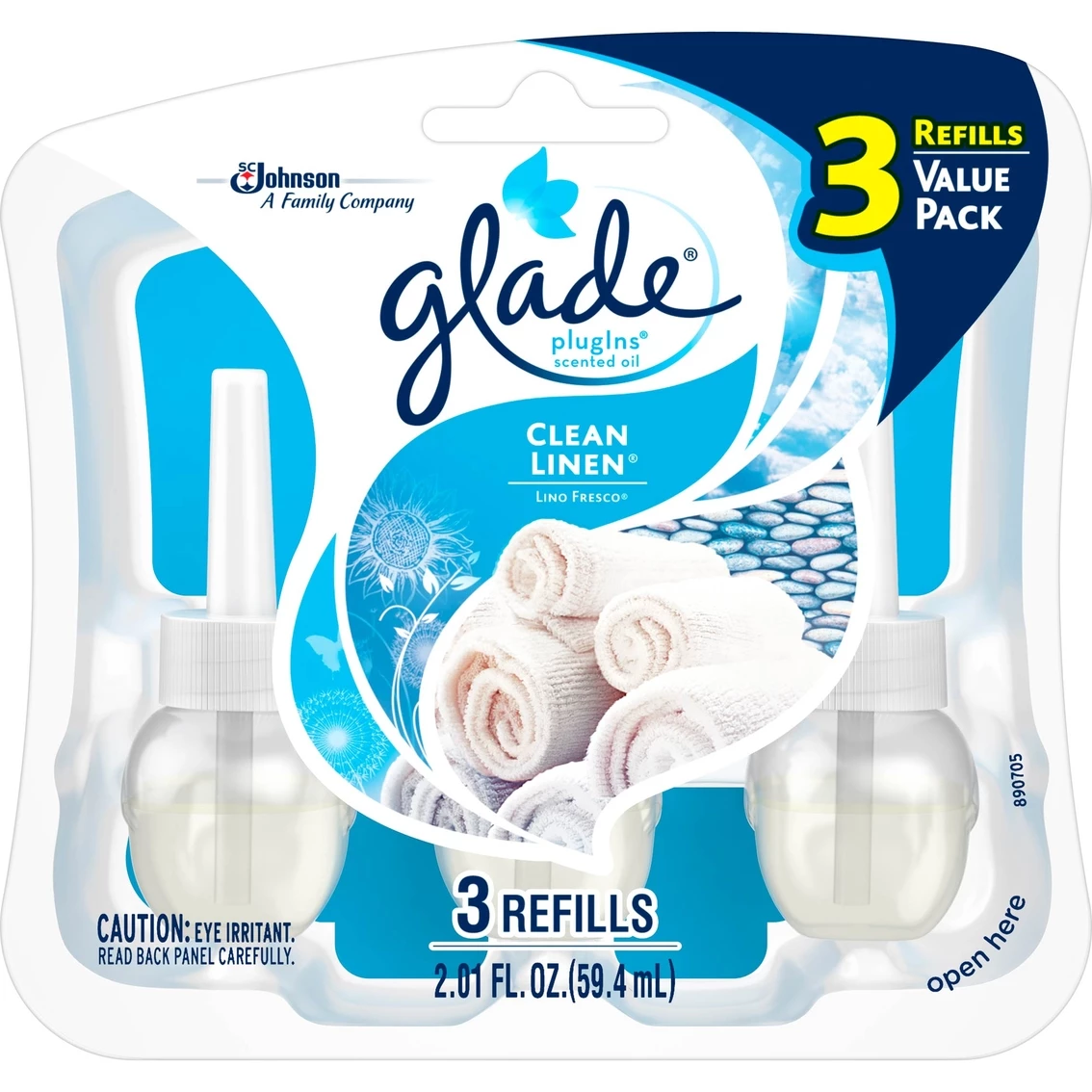 Make your home more inviting with the classic scent of line-dried laundry with the Glade PlugIns Clean Linen Scented Oil Refills. With each refill lasting up to 30 days, simply plug in the warmer for long-lasting fragrance that’s adjustable to fill any room in your home. Pack of three. Size: 2.01 oz. each. Model: 72442.