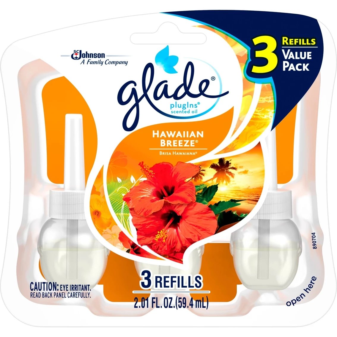 Continuous fragrance for any size room is just an outlet away with these Glade PlugIns Hawaiian Breeze Scented Oil air freshener refills. With each refill lasting up to 30 days, simply plug in the warmer for long-lasting fragrance that’s adjustable to fill any room in your home with the scent of fragrant tropical fruits, pineapple and plumeria. Product not formulated with phthalates. Pack of three. Size: 2.01 oz. each.