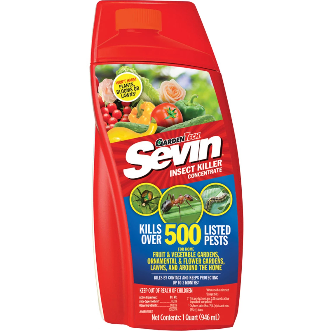 GardenTech Sevin Insect Killer Concentrate kills over 500 listed pests. Won’t harm plants, blooms or lawns. Use in fruit and vegetable gardens, ornamental and flower gardens, lawns and around the home. Kills by contact and keeps protecting up to 3 months. 32 oz.