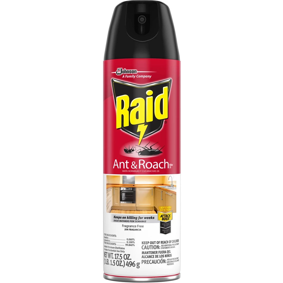 Raid Ant & Roach Killer kills fast on contact and keeps killing with residual action for up to four weeks. The easy-to-use spray ensures complete coverage of the areas ants, roaches and other listed bugs may be infesting. It leaves no lingering chemical odor. Model: 11717.
