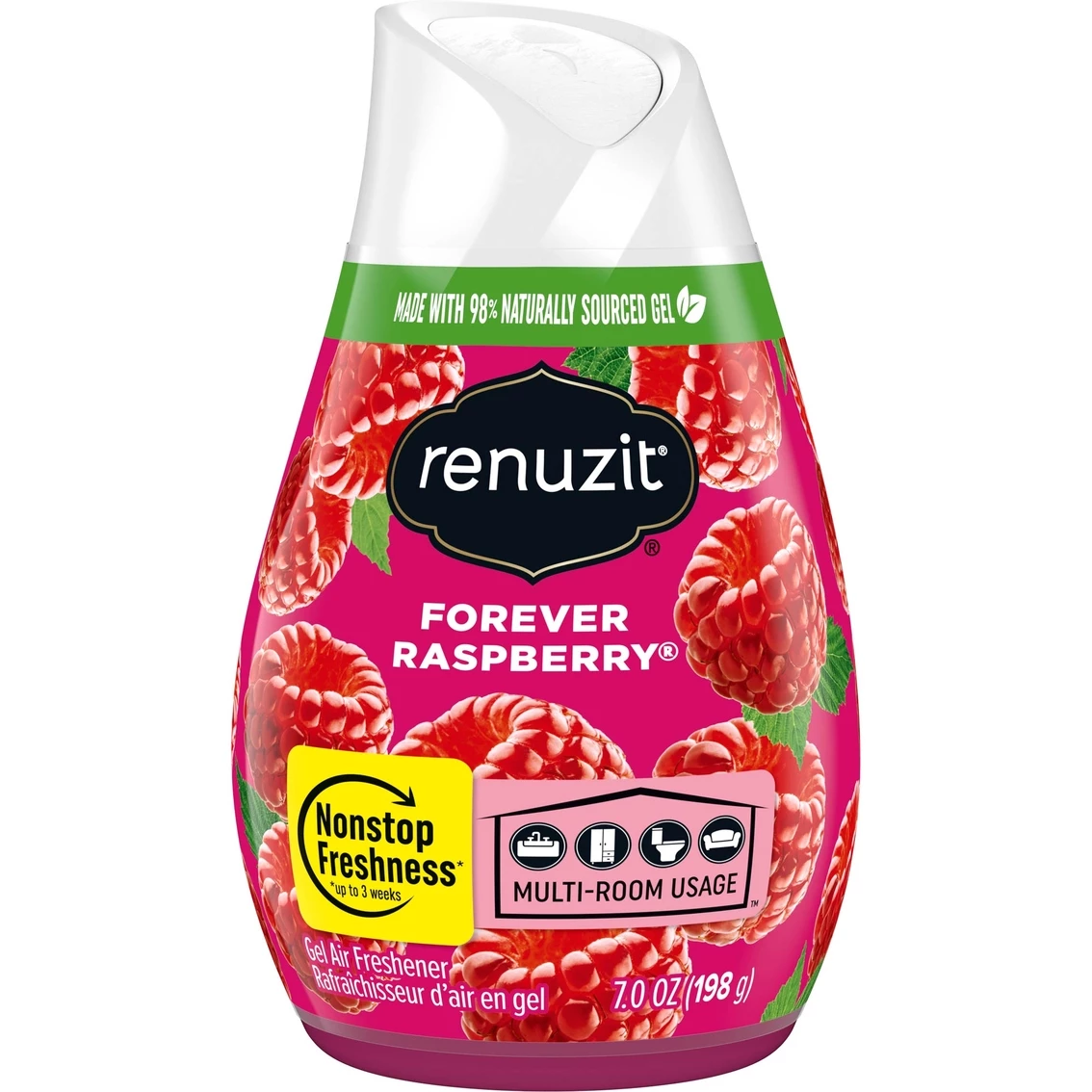 Keep your home smelling fresh with the tartly sweet scent of this Renuzit Forever Raspberry Adjustable Cone Air Freshener. A burst of cherry, raspberry and floral clove captures the scent of happiness in red. Adjust the cone to get the level of fragrance that is perfect for you. Great for small spaces, it lasts for 30 days and is made with 98% biodegradable gel. Size: 7 oz.